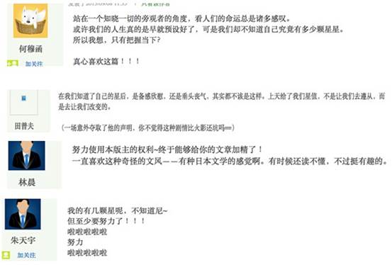 我在布置作業(yè)時要求學生除了提交自己的文章外,還要閱讀并評論其他同學的文章。學生用回復的方式進行評論,應不少于5篇。評論的內(nèi)容要有一定的質量,不能僅僅是“寫得好!”“點贊!”這樣的語言。學生在提交完作業(yè)后的一周時間內(nèi),可以隨時上網(wǎng),點擊閱讀,評論自己感興趣的文章。每篇文章的點擊量和評論數(shù)都非常清晰地顯示在論壇的統(tǒng)計數(shù)據(jù)中,評論寫的多的同學還能不斷積分。這些都可以讓學生感覺受到關注,有成就感。其實學生在挑選自己喜歡的文章進行評論之前,閱讀量一定已經(jīng)大大超過規(guī)定的5篇,更有很多同學是要把班里其他同學的文章都仔仔細細讀一遍的。評論有極大的鼓勵作用,有一次,一位學生寫連載小說,其他同學看的高興,等不及兩周一次更新,天天催促,于是那位同學奮筆疾書,連寫了一周。